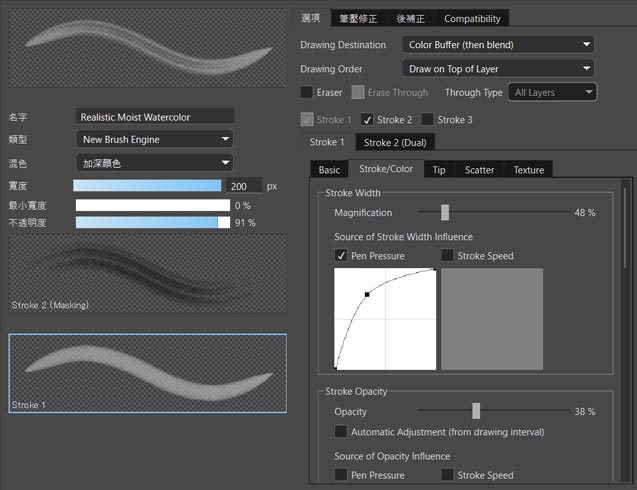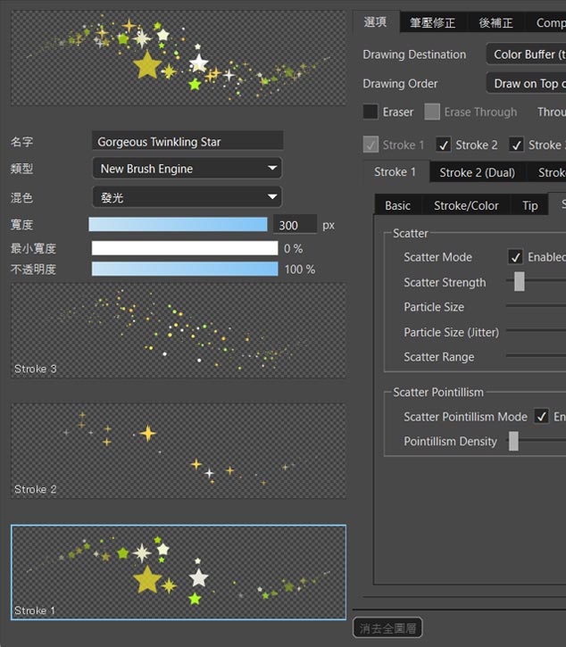 全新笔刷引擎,突破了传统引擎仅能绘制单笔触的限制,可叠加最多三笔触,实现更丰富的层次表现。