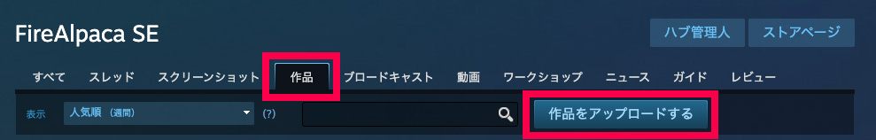 FireAlpaca SEコミュニティハブ内の「作品」ページより、公開設定を「公開」にしてアップロードしてください。