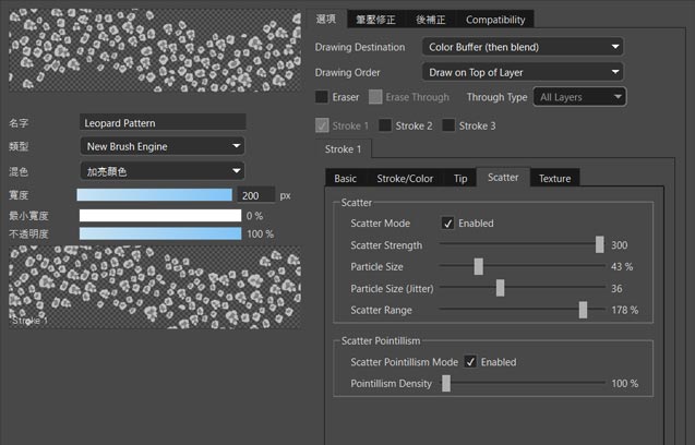 散佈選項新增「散佈點描模式」設定,可避免筆觸重疊。