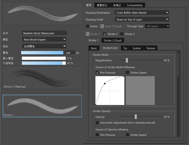 筆刷編輯的「後補正」功能可自動調整繪製線條。內建「強制起筆收筆」、「墨水積聚」、「手寫字體」等預設效果,亦可自由自訂。