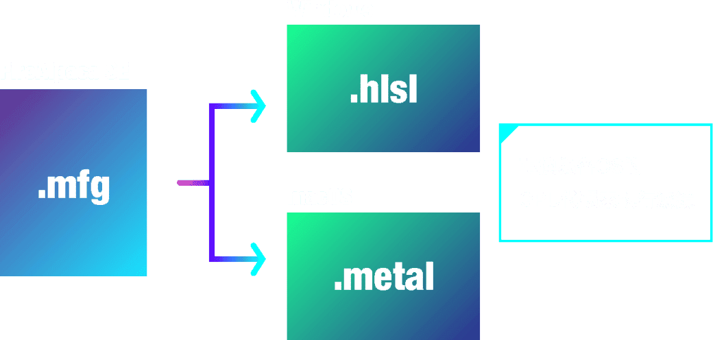 過往在新增濾鏡時,需將DLL等編譯庫作為外掛程式追加。此方式不僅需為不同作業系統準備專屬庫檔,部分系統更禁止安裝此類外掛。MFG透過專用語言編寫濾鏡,可生成針對各作業系統優化的著色器指令。僅需單一原始碼(濾鏡處理的MFG程式碼),即可實現充分發揮GPU效能的濾鏡處理。無需準備開發環境,即可開發並新增具備高速處理能力的濾鏡。